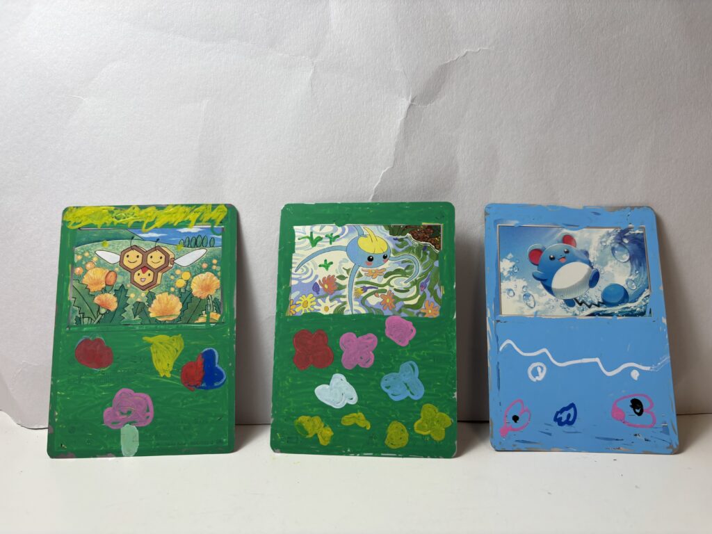 ポケモンカードをやっていると不要なカードが大量発生さてしまいます。もったいないのでライフサイクルを考えてみた結果、娘はポスカでアート作品を作り、息子は坊主めぐりっぽいオリジナルの遊びをして楽しんでもらうことにしました。